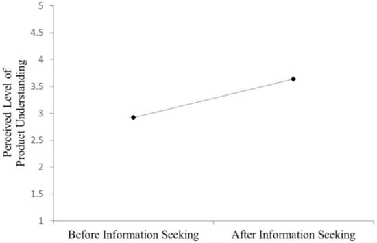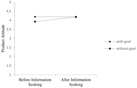 Before our main analysis, a paired t-test showed a significant main effect (p < 0.01) that when participants proceeded to the additional page to view more specific product information, they showed a higher product attitude (M = 4.14) than when participants did not access additional product information (M = 4.01). Supporting Hypothesis 2a, this result indicated that information-seeking behavior increased participants’ attitudes toward the product. To provide interaction effect support for Hypotheses 2a, we conducted a repeated measure ANOVA on product attitude before and after seeking additional product information on the goal-primed group and the control group. As expected, the interaction effect was significant (F(1,98) = 3.93, p ≤ 0.05). Consistent with our Hypothesis 2a, participants who did not have an activated goal showed a more favorable product attitude toward the product after they undertook information-seeking behavior (Mbefore = 3.93 vs. Mafter = 4.20). In contrast, accessing an additional information page did not influence product attitude among participants who had an activated goal (Mbefore = 4.20 vs. after = 4.19; see Figure 4). Note that we did not find any gender difference in terms of product attitude (Mmale = 4.15 vs. Mfemale = 4.26; F(1,98) = 0.16, p > 0.05). Differently from the intuitive prediction that women may be more influenced by a parenthood goal message type as they usually buy the products related to children, our data showed that male participants were influenced by goal message type as much as female participants. We believe our findings echo the findings that male consumers do not behave differently from female consumers in the online shopping context [].