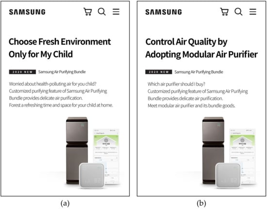 Design: Participants were randomly assigned to a between-participant with or without goal condition. In a with-goal situation, we primed participants with a goal on the main page. According to Bargh’s [,] research, goals can be activated unconsciously through environmental stimuli such as advertisements and product packages. To manipulate the goal, we displayed a main product description page with a parenthood goal such as “Choose only a fresh environment for my child”. We manipulated the main page with a neutral paragraph for the without-goal group such as “Control air quality by adopting a modular air purifier” (see Figure 3 for details of stimuli).