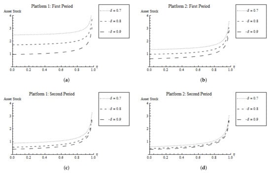 A higher depreciation rate means that the two periods are less connected with each other. The case reflects a situation in which platforms do not lose any (technological) knowledge over time. Thus, there is high technological carry-over of the asset stock in that case. On the other hand, platforms do not benefit from previous investments if . Thus, there is no carry-over of the asset stock in that case.