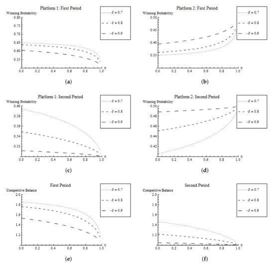 Winning probabilities and competitive balance for quadratic costs. (a) Platform 1: First period, (b) Platform 2: First period, (c) Platform 1: Second period, (d) Platform 2: Second period, (e) First period, (f) Second period.
