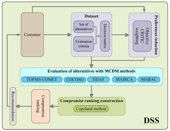 The use of MCDM in DSS increases their efficiency [30]. DSSs consist of three main components: data integration, Data Mining (DM), and MCDM. In the third module, MCDM methods are used to evaluate the currently available alternatives, find the most satisfactory options, and make appropriate reactions in a timely manner [31]. The performance of MCDM-based DSS requires a defined fixed set of criteria that presents the decision-maker with a clear representation of all available alternatives. The task essentially is to calculate the score of each alternative, thereby creating a ranking and selecting the one that maximizes that value [32].