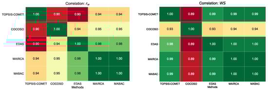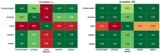 The evaluation criteria in this study are quantitative measurement data. In such a case, the CRITIC method gets all the information included in the criteria of assessment. Therefore, CRITIC’s objective weighting methods may demonstrate more realistic results due to varying weights to criteria. This method, similar to Mean Weight (MW), Entropy method, Standard Deviation (SD), and Statistical Variance procedure, belongs to objective methods that calculate weights by solving mathematical equations omitting to take into account the decision-maker preferences [55]. The use of subjective methods to determine weights raises questions about the reliability of the results obtained. Objective weighting techniques are used to overcome this problem. For this purpose, the CRITIC method was proposed by Diakoulaki et al. in 1995 [56]. This method takes into consideration the intensity of the contrast occurring in the structure of the decision problem. Determination of contrasts between criteria is possible after performing fundamental statistical operations, such as correlation analysis [57]. During the weighting process, both the standard deviation of a criterion and its correlation with other criteria are considered [58]. The CRITIC method belongs to the class of correlation techniques. In this method, the intensity of contrast and conflict in the decision problem structure is considered. In addition, the decision matrix is examined to determine the information included in the criteria for assessing the alternatives [59]. In the literature, many examples of the use of the CRITIC method for weights computation in combination with MCDM methods can be found, both known for many years and developed in recent times, employed to obtain the rankings of the assessed alternatives in multi-criteria problems, for example, TOPSIS [58], VIKOR [55,60], MAUT [61], WASPAS [57,62], AHP [63], EDAS [64], COCOSO [65,66], MULTIMOORA [67], and CODAS [60].
