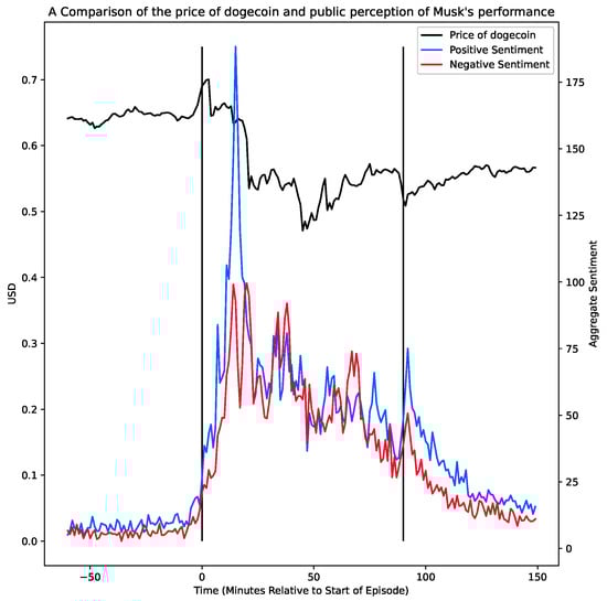 As can be seen in Figure 1, the general trends of positive and negative sentiment were similar. Twitter activity pertaining to Musk’s performance spiked just as the episode began to air, reaching a peak around 15 min into the episode. From there, a steady decline in both positive and negative sentiment, driven by a decrease in the volume of tweets pertaining to Musk’s performance, was observed. A small spike in both positive and negative sentiment occurs shortly after the conclusion of the episode, likely driven by summary reviews of the episode, but once the episode had finished airing, the volume of tweets steadily declined to pre-episode levels. The sharp, early decline in the price of Dogecoin, a loss which was never recouped, coincides with the outburst of opinions on Twitter pertaining to Musk’s performance on SNL.