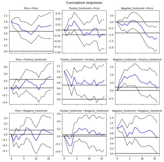 Looking at the impulse response functions, we see that negative sentiment had a delayed but significant effect on the price of Dogecoin. There was a steady decline in the impulse response function from 5 min to 12 min, and this effect can also be seen in the point estimates from the VAR model for the price of Dogecoin, where the lagged values of negative sentiment for 11 and 12 lags (L11 Negative Sentiment and L12 Negative Sentiment) were negative and statistically significant (Table A1). What this shows is evidence that increases in negative sentiment led to Dogecoin users selling their holdings. Trades began to be finalized in earnest approximately five minutes after an event occurred that led to an increase in negative sentiment, and this behavior continued until the cumulative effect of these sales led to a statistically significant decrease in the price of Dogecoin, occurring approximately at the 12 min mark.