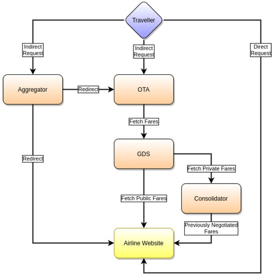 Before introducing the empirical analysis, it is important to briefly summarize the structure of the airline tickets markets to fully understand the subsequent steps. As shown in Figure 1, apart from travelers (i.e., the demand side), the airline tickets market mainly consists of: airline companies (e.g., Alitalia, Rome, Italy; Lufthansa, Cologne, Germany), Global Distribution Systems (GDSs) (e.g., Amadeus, Madrid, Spain; Sabre, Southlake, TX, USA; Travelport, Langley, Slough, United Kingdom), online travel agencies (OTAs) (e.g., Viator, San Francisco, CA, USA; Expedia, Redmond, WA, USA), content aggregators (e.g., Skyscanner, Edinburgh, Scotland, UK; Kayak, Stamford, CT, USA), and consolidators (e.g., Mondee Group, Silicon Valley, CA, USA). They tend to adopt common standards and protocols to share information and regulate the market. Traditionally, the airline companies use to set prices and tariffs according to the flights information, and then to transfer these offers to the Global Distribution System (GDS). These few players, in turn, use their network to transmit these offers to the travel agents. Among the remaining players, the GDSs usually interact with OTAs, which offer customers the possibility to comprehensively organize their travel, from flights booking to hotels. Differently than OTAs, the content aggregators are search engines that help customers in comparing all the available offers and then redirect them to the service provider. Finally, the consolidators are middlemen that sign private agreements on tickets tariffs with the airline companies, and resell them to large companies, or OTAs. Figure 1 provides a schematic overview of the ticket distribution channels.