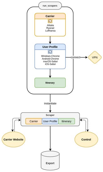 After having analysed the flight search workflow, the template method design pattern was chosen to design the scraper. The main reason for choosing this pattern is that it allows scalability to extend to further airline carriers for future researches. The architecture of the software is shown in Figure 2. The software consists of four main components, i.e., the scraper, which handles data acquisition, the airline carrier that models an airline, the user profile that represents a customer with its browser and operating system, and the flight itineraries. For more details about the software architecture and its modules the reader may refer to Additional File S1 (Supplementary Materials).