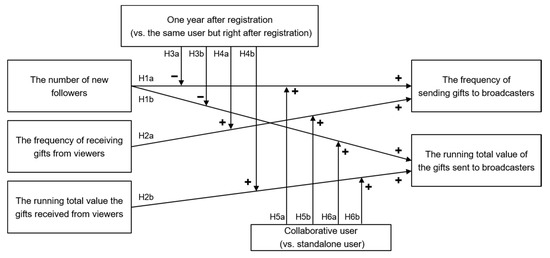 Users not only attract followers but also receive paid gifts, either from followers or from other users. Social exchange theory suggests that the users, upon receiving the gifts, tend to reciprocate. One way to reciprocate is directly giving back. For example, Reyes [44] reported the direct reciprocation of a birthday greeting on a social network website. Another way to reciprocate is more indirect, such as receiving online health support from one user but offering support to another user [45] or seeking online review opinions from some users but giving opinions to other users [46]. According to social exchange theory, indirect reciprocation creates group gain by putting the benefits of exchange into a common pot. This is expected to apply to online karaoke platforms where users interact in a community of shared interests. Specifically, on some occasions, when two users are mutually viewers and broadcasters, they may directly send paid gifts to each other upon watching each other’s videos. On other occasions, when the gift sender only views others’ videos but does not broadcast her own, the user may not directly receive a gift back but can still benefit from group gain, including the sense of being connected, social cooperation, and collective satisfaction, triggered by the gift receiver passing the gift on to a third user. Taking direct and indirect reciprocation together, the following hypotheses are proposed: