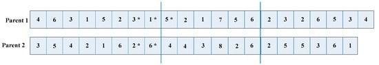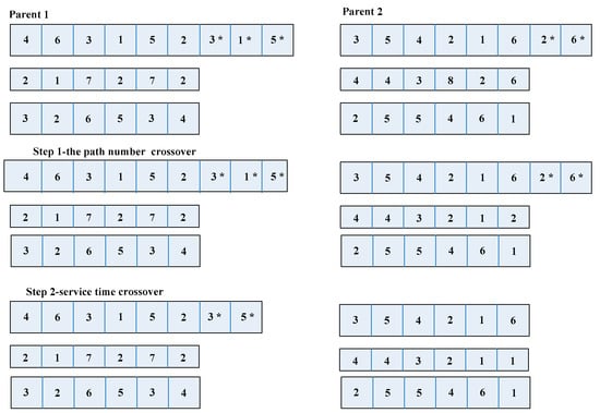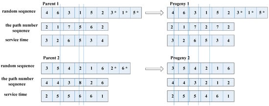 Because the chromosome has three levels and is encoded with different types of data, the crossover operations at different levels must be performed independently. First, the first and second tiers remain the same, with two crossings during the third tier service hours. Secondly, the path sequence of the second level changes correspondingly but its value remains unchanged, the customer’s service order is updated and two offspring are generated. Finally, two new crossover operators need to be extracted and generated again. In the process of generating the crossover operator, the customer service order, route sequence and service time will change accordingly. The cross process of the multilevel genetic algorithm is shown in