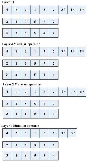 The mutation process is similar to the iterative crossover process. The first and second levels remain unchanged, starting from the third level and requiring only one parent. As for mutation, because the supply chain integration scheduling problem is subject to multiple constraints such as time and resource availability, in order to meet the constraints, the location of the mutation operation must be limited to a specific range. As shown in