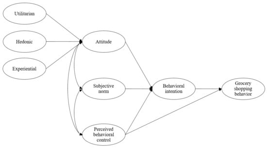 Attitudes, subjective norms, and perceived behavioral control are based on accessible control beliefs [63]. Subjective norms are the perception of an individual about what should or should not be done in accordance with the reward or the punishment that may be obtained from carrying out such behavior [66]. According to Ajzen, subjective norms reflect the level of perceived social pressure to engage with behavior [64]. Thus, subjective norms are defined in the consumer behavior context as persuasion a consumer receives from friends, family, and colleagues to make purchases through online stores [69]. Subjective norm can be a word-of-mouth (WOM) that facilitates consumers’ subsequent behaviors. In a study on mobile meat purchase app use, important others’ voices were the best predictor of a mobile slaughter unit’s use [70]. Social media influencers are a proper example of subjective norm. The interactive interface with influencers’ engagement on social media provided users with higher brand recognition [69]. Driediger and Bhatiasevi showed that intention to use and subjective norms had a significant relationship with the acceptance of online grocery shopping [3]. Brand et al. suggested that perceived behavioral control, positive attitudes toward e-commerce, and socio-environmental aspects of personal norms were more significant than the shopping aspect of personal norms, innovativeness, and any negative attitudes in online grocery shopping use [1].