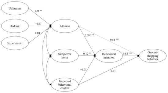 The results of the structural model analysis revealed that four of the eight structural hypotheses acquired support (Table 5). Significant positive relationships were observed between utilitarian motives and attitudes (confirming H1), attitudes and behavioral intention (confirming H4), subjective norms and behavioral intention (confirming H5), and behavioral intention and grocery shopping behavior (confirming H8). However, no significant relationships were observed between hedonic motives and attitude (rejecting H2), experiential motives and attitude (rejecting H3), perceived behavioral control and behavioral intention (rejecting H6), and perceived behavioral control and grocery shopping behavior (rejecting H7) (Figure 2).