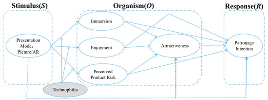 The Stimulus-Organism-Reaction (SOR) model has been widely used to study consumer behavior in the e-commerce environment [28,29,30]. It uses three steps to describe how individuals react to stimuli in the environment. In this model, stimuli (S) in the environment influence an individual’s internal states (O), and then these internal states of emotion and cognition cause two contrasting responses (R) in the consumer: approach or avoidance [28,31,32]. The model was originally designed for general environmental psychology but has been verified to work effectively in retail settings [33], including e-commerce [29,30,34,35]. For retailers who want to increase the number of customers’ approach behaviors, the model can be used to identify how different stimuli affect consumers’ responses. Thus, it is critical to find out what environmental factors generate targeted consumer pleasure, and finally, induce consumers to spend more time and money. As it becomes increasingly difficult for online stores to gain advantages from price, convenience, range and transactional efficiency, presentation modes applying new technology provide an additional advantage for some stores to trigger consumers’ shopping arousal during the purchase process. As for AR presentation mode on e-commerce websites, it allows consumers’ physical body parts and virtual products to reside simultaneously in consumers’ mobile screens, and it greatly enriches consumers’ online shopping experiences. AR is particularly suitable for wearable products (e.g., glasses, shoes, rings, watches, clothes, earrings, etc.), as it provides consumers with the enjoyment of viewing themselves wearing diverse products without physically going to a store [11]. Applying the S-O-R model to the present study, product presentations in picture and AR forms (S) are posited to stimulate different affective and cognitive states (O) in consumers, which in turn induce positive or negative behavioral intentions (R) as responses. In addition, technophilia as a personal trait is posited to moderate the effect of digital presentation mode on consumer responses.