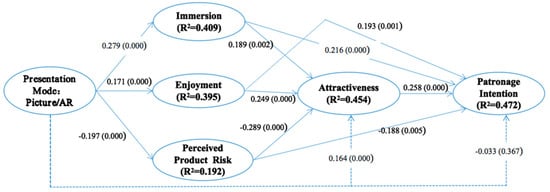 Besides the collinearity test mentioned above, a bootstrapping procedure with 5000 subsamples was conducted to examine the main effects. As depicted in Figure 2, all paths are significant at 0.01 levels, except for the direct relationship between product presentation mode and patronage intention. The Stone-Geisser Q2 values obtained through the blindfolding procedures for immersion (Q2 = 0.290), enjoyment (Q2 = 0.308), perceived product risk (Q2 = 0.121), online store attractiveness (Q2 = 0.326) and purchase intention (Q2 = 0.354) were larger than zero, supporting the predictive relevance of the model. Additionally, the standardized root mean square residual value for the structural model was <0.08 (0.061 for our model), which indicated a good model fit [77].