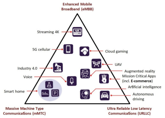 The range of potentially promising services that can be implemented precisely through the capabilities of 5G generation communication networks is not limited to the mentioned eMBB, URLLC, and mMTC. These services only represent the most typical real-world scenarios that have polar requirements for the quality characteristics of communication services. These good services form the base, which, in Figure 1, is presented in a triangle [17]. The sides of the triangle symbolize the fixed quality requirements for access speed, transmission reliability, and delay time. Some applications can be implemented both inside the triangle and on its faces by combining the appropriate set of these quality characteristics.
