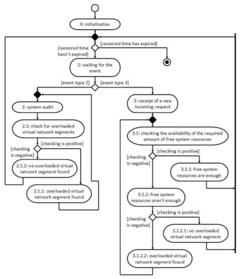 - If the overloaded virtual network segment is found, then the functional algorithm described in Section 3.3 is implemented. Then, the control mechanism described in Section 3.4 redistributes system resources, and the system returns to stage (3.1).