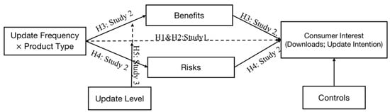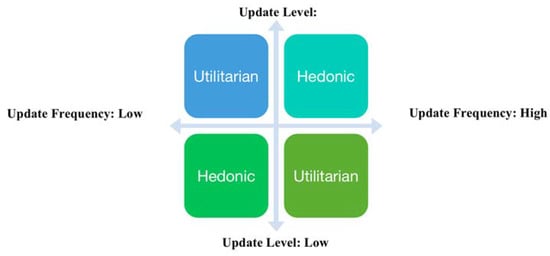 The majority of recent app enhancement research has focused on app updates. This line of research centers on how the form of update and the update time pattern influence consumer perceptions and decisions [9,10,11]. In addition, previous research has primarily focused on the benefits that a product update brings to customers while ignoring the potential loss perception of customers during the update process. There are few studies focused on the interaction of the two terms, i.e., the form of update and the update time pattern. According to the theory of mental accounting [12,13], frequency of losses and gains can affect the value perceptions of customers, and we argue that update frequency will influence the value perceptions of customers, and therefore their interest based on the degree to which they anticipate gains or losses. Furthermore, consumer goals for gains and losses can be contextually triggered by priming and message framing strategies [14], such as product type. Therefore, in contrast to previous studies, we focus on the combined effect of update frequency and type of update, considering both the benefit and risk perception of consumers in the continuous updating process. Specifically, we examine how update frequency affects consumer interest for different types of updates—that is, whether developers update on a hedonic product vs. a utilitarian product, and we also look at the boundary effect of update level on the former relationship.