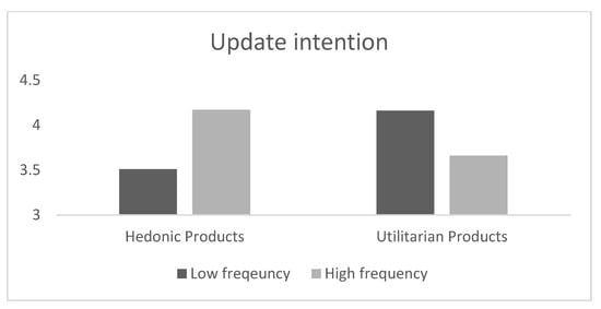Product type had a significant main effect on update intention (F (1,126) = 5.56, p = 0.019). Ad attractiveness had a significant main effect on update intention (F (1,126) = 25.64, p = 0.001), but did not interact with product type or update frequency (ps > 0.10). The interaction effect of product type and update frequency on update intention was significant (F (1,126) = 8.86, p = 0.003), supporting our line of reasoning. The follow-up contrast analysis revealed that high product update frequency led to high update intention for hedonic products (Mlow = 3.51 Mhigh = 4.17, F (1,126) = 6.10, p = 0.015) (Figure 2). However, subjects reported higher update intention for utilitarian products with low update frequency than products with high frequency (Mlow = 4.16 > Mhigh = 3.66, F (1,126) = 4.51, p = 0.0036). These findings support H1 and H2.