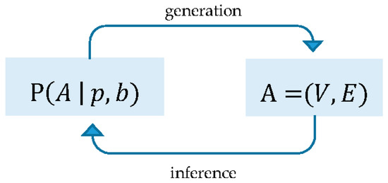 SBM generation and inference model. Generation: given probability distribution () of blocks b, draw network A. Inference: given network A (V vertices, E edges) choose that makes A likely.