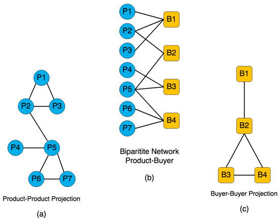 To link two co-purchased products, we should first create a bipartite network where there are two distinct types of nodes: buyers, and products. We draw an edge between a buyer and a product in this model if the buyer has purchased the product. In bipartite networks two types of nodes never link among themselves, they only connect with the opposing type. Figure 3b shows a simple model of a product-buyer bipartite network along with two projections at both sides.