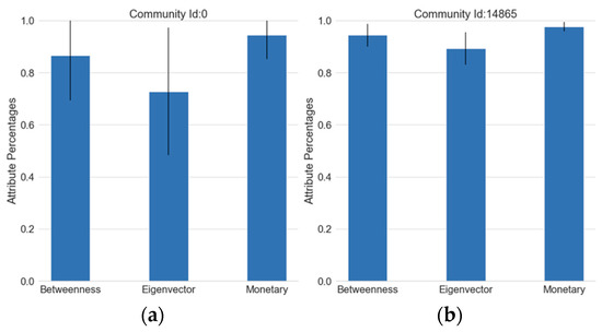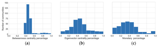 Examining the betweenness attribute in Figure 5a, we observe that none of the communities have a mean percentage lower than 35%, and many communities lie between 35–55%. The rest are very low values, and they are almost equally distributed. The eigenvector centrality is close to a normal distribution (Figure 5b). As for the monetary attribute (Figure 5c), the range between 30% and 50% has the largest number of communities.