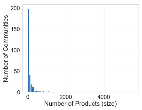 There is a community with 5543 products, another with 4683, and the following largest six communities contain between 1000 and 2000 products. We use the community size histogram to determine the cutoff thresholds for level labels; small, medium, large (Figure 6). Table 3 is a list of the cutoff points determined by examining their distributions.