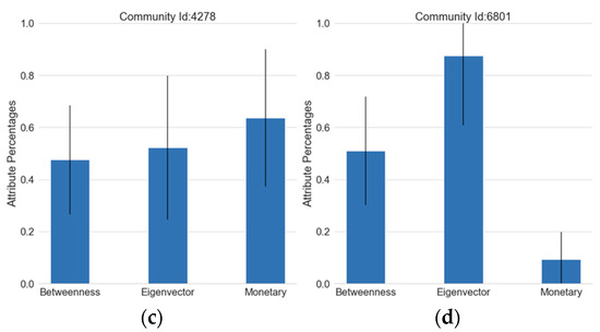 Mean attribute percentages and standard deviations of four selected communities. Community with high values in all attributes (a), small standard deviation values (b), high monetary attribute (c), high eigenvector attribute (d).