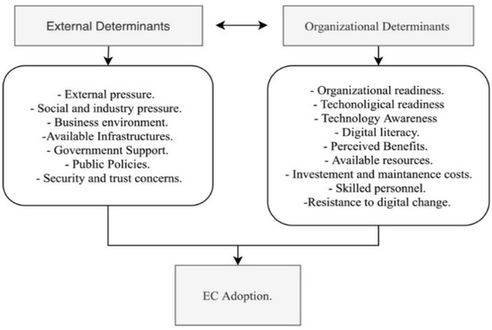 We observed in the sampled articles two main vectors of influence impacting SMEs’ EC adoption: (1) external determinants; and (2) organizational determinants (Figure 2 below).