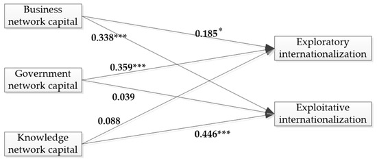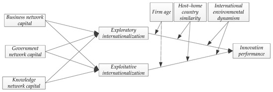 The first research gap is that there is little systematic evidence on whether and how firms adopt different social networks to carry out exploratory and exploitative internationalization. Lacking international resources and experience, the optimal choice for firms in an emerging economy to push internationalization is to rely on network resources [13,14]. Such networks play a valuable role in establishing channels to much-needed knowledge and financial resources, thereby increasing internationalization speed and lowering internationalization risks [15]. Although existing studies in the international business field have empirically tested the effect of ties with government officials and business managers for firms’ internationalization, these researches treat internationalization as a whole strategy and obtain no consistent conclusion [16,17]. Therefore, it is necessary to test the differential impact of specific network resources on both types of internationalization. Except that, research in the organizational learning field can inspire us and has indicated that social capital is the key antecedent of exploration and exploitation, but these researches mainly focus on the intraindustry and extraindustry managerial ties, and do not uncover whether exploration or exploitation can be more appropriately promoted by a specific network [18,19]. This study divides social capital into more components, including business network capital, government network capital and knowledge network capital, and examines the differential influences of specific kinds of social capital on exploratory and exploitative internationalization.