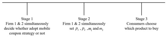 Firm i chooses whether to adopt LBMC promotion first. Then, each firm simultaneously sets its retail price and the face value of its mobile coupons. (Moraga-Gonzalez and Petrakis [58] modeled coupon advertising in a competitive market by simultaneously choosing the price, rebate, and intensity of couponing.) We make this assumption because the price decision can be changed rapidly according to market feedback and/or other factors in the wake of electronic commerce with mobile technology. While, before the age of the Internet, pricing was a long-term decision where managers started with an annual promotion schedule and only when the time for executing the promotion decision arrived, did that they decide whether to promote or not [59]. Shaffer and Zhang [16] also assumed in their study that coupon targeting decisions were made subsequent to the decisions on prices and coupon face values. Rao [60] observed that, in practice, regular prices were often chosen first, followed by the choice of promotion depth in a competitive environment.