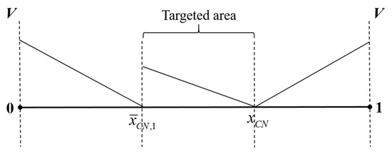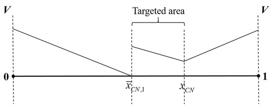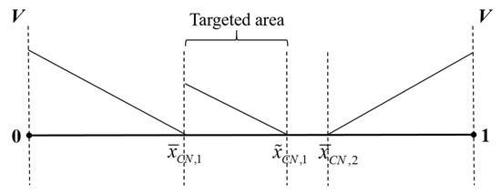 Finally, the intermediate values of , i.e., , represent that the market is moderately competitive. In this case, there exist multiple price equilibria. Each of these equilibria corresponds to the location of a consumer’s indifferent point between purchasing either firm’s product . Since the firms are a priori symmetric in the market, first, we focus only on the symmetric equilibrium (this is analogous to the focal point refinement [63], which is the most natural choice given the shared understanding of the environment by both firms) [62,64] such that the consumer’s indifferent point between buying from either firm is . For each , the equilibrium prices are and , the equilibrium demands are and , and the equilibrium profits are and for Firm 1 and Firm 2, respectively. Given the assumption, in this case, the equilibrium prices are and the equilibrium demands are , so the equilibrium profit of each firm is .