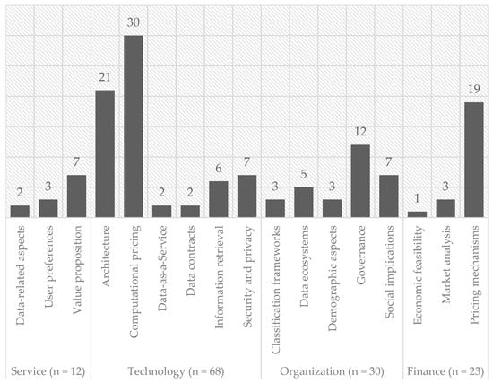 Most publications fall within the STOF technology domain. This domain is divided into six categories (refer to Table 3). In our sample, the first identified category is architecture. Architecture of data marketplaces can be loosely described as building blocks of technical components. The discussion in the architecture category is primarily dominated by blockchain-based systems, which relates to the development of peer-to-peer and decentralized data marketplaces [27,28]. Specifically, the blockchain systems are applied to specific contexts such as the automotive domain [29,30], private data sharing [31], Internet of Things (IoT) [32,33,34,35], or smart cities [36]. In other cases, blockchain-based systems are employed for proposing auditing schema [37], credit scoring [38], data transaction integrity [39], and Proof of Usage (PoU) algorithm [40]. Beyond the blockchain-based systems, the proposed architecture specifically highlights data access and control based on the International Data Space (IDS) reference architecture [14]. Beyond the blockchain-based architecture, Matzutt et al. [41] discuss a conceptual architecture for personal data marketplaces, focusing on protecting data privacy, while Mišura and Žagar [42] focus on IoT devices. In addition, Sánchez et al. [43] propose a data marketplace architecture to federate multiple-domain IoT; Pillmann et al. [44] propose an information model to provide a single point of access for vehicle data. Finally, Li et al. [45] propose a cost-efficient middleware for data acquisition service; Ren et al. [46] introduce infrastructure architecture for data placement.