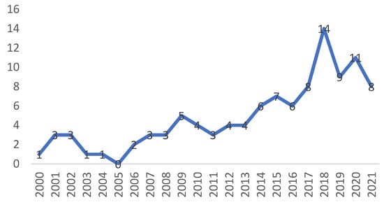 The 106 articles spanned from 2000 to 2021. Figure 1 displays the distribution of the research articles across the study period.