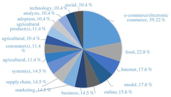 Figure 2 displays the keywords that appeared more than 10 times and their percentage found in our research papers. There are five papers lacking keywords; we therefore collected 101 sets of keywords. As can be seen in Figure 2, e-commerce/electronic commerce is the most frequently used keyword, which has been used for 59 times. “food” follows with 22 instances; “Internet” and “model” follow with 17 instances; and “online” appears 15 times. “Business”, “marketing”, “supply chain” appear 14 times each, indicating that our research is intertwined with the marketing domain and that our research is multi-disciplinary in nature.