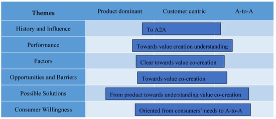 As can be seen, at the end of the theme’s spectrum, themes are clearly approaching A-to-A value co-creation. On a literature level, themes focus on Opportunities and Barriers, Possible Solutions and especially Consumer Willingness are gradually lay more attention on how to achieve consumers’ satisfaction and how firms and consumers could integrate their resources to co-create value as a mutual service process. Wu (2018) [65] points out that it is necessary for companies to understand customers’ satisfaction, which directly leads the agricultural e-commerce to A2A direction in his research.