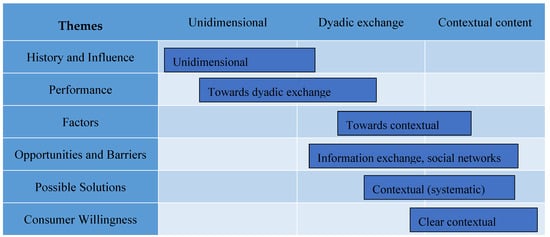 As we can see from Figure 4, most of the research has an orientation towards contextual and systematic content. An exception is the papers in the History and Influence theme, which try to give a brief overview of AE’s development without diving into multi-dimensional contents, thus being more unidirectional (see Yang et al. (2020) [69] as an example). The theme of Performance starts to consider cultural backgrounds and customs when evaluating AE performance; this theme therefore shows an attempt towards dyadic exchange (through agribusiness companies to consumers, vice versa), but still does not take the exchange context into contextual consideration (for example, advocating communities or third parties join in the exchange process). The theme of Opportunities and Barriers analyzes how social networks and information exchange could bring new opportunities to the AE and reach more consumers; examples are A. Dal Vecchio et al. (2018) [50], Borsellino et al. (2018) [51], etc. As for the theme of Consumer Willingness, all research takes consumers as the starting point and the center of the research, trying to understand consumers in their context, and this theme shows a dominant orientation in the exchange content.