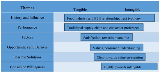 Intangible exchange in our research refers to concepts related to consumer values, decision making, loyalty, consumer satisfaction, attitudes, perception, etc. We find that the theme of History and Influence, and Performance are in the transition stage, as research in each theme is nearly halved into both tangible and intangible content. For example, Canavari et al. (2010) [49] pay special attention to trust in a traditional B2B relationship and in an electronic context, while Baourakis et al. (2002) [15] introduce the impact that e-commerce has on the agri-food industry and marketing. Consumer Willingness leans strongly towards intangible exchange, because customer relationship management [64], customer satisfaction [65], loyalty, trust, etc., are largely discussed in this theme, but tangible resources, for example, web assurance seal services [66], and product and price [67], are still partly within the discussion. The Possible Solutions theme contains abundant intangible content such as political suggestions to encourage government participation [120], an optimization model of the agricultural products’ distribution in an e-commerce channel [112], information sharing [117], etc. In the theme of Opportunities and Barriers, papers try to illustrate potential avenues and opportunities through intangible perspectives, for example, by using the SWOT method to describe AE strategies [100], legal regulation of digital development [102], etc. Papers as such bring this theme to a clear intangible orientation. The Factors theme shows more tangible manifestation as more papers concentrate on logistics processes [78], computer equipment [82], industry structure and product complexity [91], website usability [35] and so on.