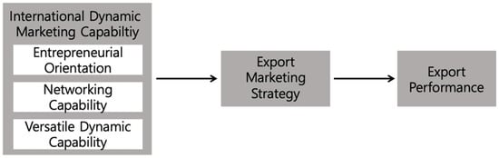 Therefore, we applied the concept of International Dynamic Marketing Capability (IDMC), which well explains how a firm purposefully integrates, builds, and modifies internal and external resources [22,45,46]. For example, export-oriented capabilities include marketing capability [47], networking capability [48], and internationalization capability [49].