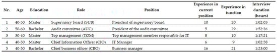 For research purposes, a semi-structured interview was used, which we conducted at the different levels in the enterprise. The interviews were conducted at the strategic level of management: (1) supervisory level: the interview included the president of the supervisory board (SUB) and the president of the audit committee (ACO); (2) top management level: the interview included the top management member (TOM), who is responsible for IT. The interview also included the Chief Information Officer (CIO) and the Chief Business Officer (CBO) as representatives of business management. Basic information about the interviewees is shown in Figure 1. Interviews were conducted with all crucial supervisory board and top management members that represent key interest groups in the enterprise’s strategic decision-making levels.