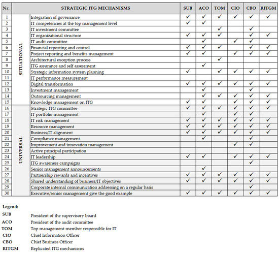 The evaluation of the mechanisms was carried out in such a way that we recorded the opinion of our interviewees on the questions raised about the mechanisms, their importance, the dependence of importance on time and other factors, their interconnection and their meaning. We then analyzed the frequencies (repeated answers) for the mechanisms they consider permanently important or situationally important. The mechanisms that the interviewees have identified as being permanently substantial have been described as universal mechanisms. The mechanisms, which in most cases are considered to be of particular situational or recurrent importance, have been described as situational mechanisms. The basis of the analysis is the number of sample matching repetitions on which the importance of each mechanism as universal or situational can be determined. Our study is exploratory and based on a case study where we used interviews. In the interviews, we followed the case study methodology proposed by Yin [90]. We systematically asked all interviewees about each ITG mechanism from three different perspectives: which mechanisms were significant at the beginning, which are essential now, and how has the importance changed over time? If the statement for a particular mechanism is repeated in four (4) out of five (5) roles of the interviewees included in the survey, the result was accepted as a satisfactory validation of the importance of the mechanism.