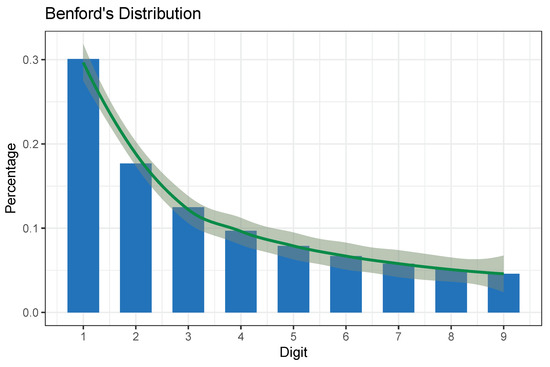 Benford’s law has been extensively used in the accountant fraud detection and prevention, and there has been a lot of research in the area, such as [13,14], who present a literature overview of the area. Ref. [15] introduces Benford’s Law and Digital Analysis (analysis of digit and number patterns of a data set), which can be used as an analytical procedure and fraud detection tool. Ref. [16] presents Benford’s law as a simple and effective tool for the detection of fraud. The purpose of the paper is to assist auditors in the most effective use of digital analysis based on Benford’s law by identifying data sets, which can be expected to follow Benford’s distribution, and presenting types of frauds that would be “detected/not detected” by such analysis. However, there are some research findings that point out some inherent problems that potentially arise in the use of Benford’s law in the auditing process such as [17].