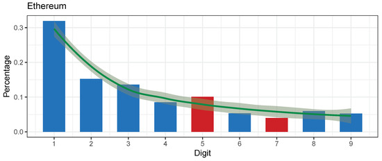 Our research experiment started with gathering all transactions on the Ethereum (ETH) network. Ethereum was chosen for these properties: It is one of the biggest cryptocurrencies by market capitalization and number of transactions processed; the network houses multiple cryptocurrencies (tokens) that could be compared directly (this part of the experiment is still open); and it is a well-documented and accessible blockchain. The first preliminary results revealed that transaction values (non-aggregated) of the whole Ethereum network do not conform to Benford’s law [1] as is presented in Figure 2. Blue color depicts the leading digits that conform to Benford’s law, red color depicts the non-conforming digits. The reasoning is further discussed in Section 4.1.