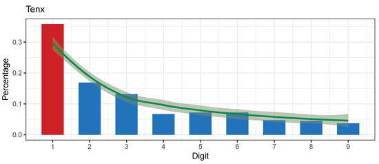 Figure 5 shows the TENX aggregated transactions and the conformance to Benford’s law. The MAD value, a well documented Wirecard scandal (Crypto.com, TenX crypto debit cards were frozen following the Wirecard scandal: https://decrypt.co/33695/crypto-debit-cards-frozen-following-wirecard-scandal accessed on 1 March 2021) shows a possible reason for non-conformity.