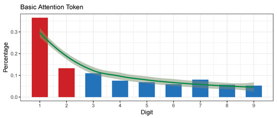 Figure 8 shows the BAT aggregated transactions and the conformance to Benford’s law. The transactions of the BAT coin are mostly automatically generated as this coin is the basis of a digital marketing platform that periodically rewards users for participation, and as such break Benford’s law prerequisites.