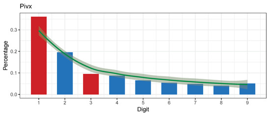 This section presents the results of the experiment following the methodology from Section 4. All the figures in this section have the same format: a graph showing the distribution of leading digits. Red colored bars represent suspect values, which skew the distribution the most. Suspects are classified where the mean absolute deviation is above the threshold of 4. The threshold can be adjusted to increase the sensitivity. Suspects are useful as a starting point for further investigation in the case of nonconformity.