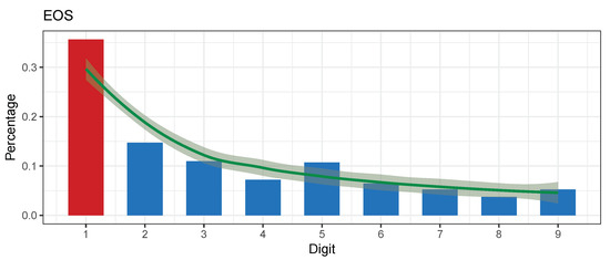 Figure 10 shows the EOS aggregated transactions and the conformance to Benford’s law. EOS is regarded as a valid project and survived until 2021. The only drawback is that in 2018, the project was in the starting phase and the backing capital risen by the backers of the project was an order of magnitude bigger than what the proposed project promised to accomplish (“Why EOS Failed to Kill Ethereum: The Fatal Flaw of Centralization in a Decentralized Market”: https://coincodex.com/article/10454/why-eos-failed-to-kill-ethereum-the-fatal-flaw-of-centralization-in-a-decentralized-market/ accessed on 1 March 2021).