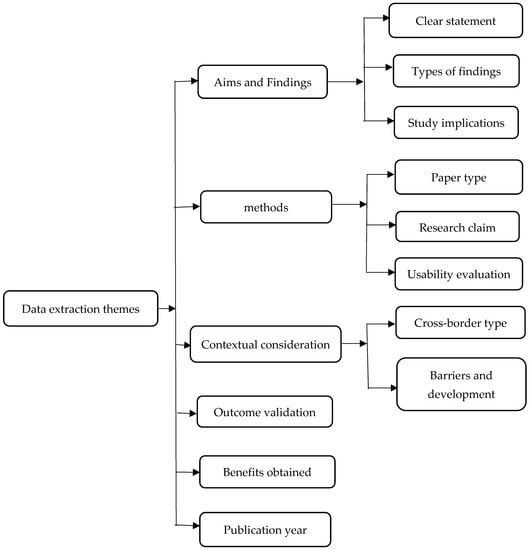 - Context consideration—We extracted information related to the cross-border and e-business type. We checked whether the paper focused on cross-border or e-business or both, and was related to the hypothesis on which the review was developed. We also checked for the cross-border and or e-commerce challenges and development concepts.