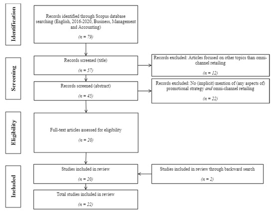 In order to better understand the implications of omni-channel retailing for promotional strategy, a critical systematic literature review was conducted, making use of Tranfield, Denyer, and Smart’s [18] method and the implementation of this method by Priante, Ehrenhard, Van den Broek, and Need [19]. This critical review aims to analyse (compare and combine) the existing research on the topics of (1) omni-channel retailing and (2) promotional strategies. These two topics were identified as a way to gather relevant literature to ascertain the effects of omni-channel retailing on the promotional strategy of retail organisations. Therefore, literature was gathered via the database ‘Scopus’ using the following string: (omni-channel OR omnichannel OR “omni channel”) AND (“promotion* strategy” OR promotion* OR “promotion* mix” OR “marketing strategy” OR “marketing mix” OR “marketing”). In order to analyse the quickly growing omni-channel retail environment, only literature from the past 5 years was considered. Further selection criteria included English-language literature published in high-ranking journals in business, management, and accounting. A total of 79 articles were refined based on title, abstract, and full text by critically examining whether the articles discussed (a form of) promotional strategy and omni-channel retailing. Including a backward search, a total of 22 relevant articles were reviewed. For an overview of the literature search process based on PRISMA, see Figure 1.