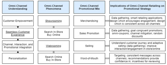 Blom et al. [26] examined the implications of using consumers’ digital shopping footprints to develop pricing promotions for brick-and-mortar stores in customer shopping behaviour. Furthermore, they also examined the implications of ‘omni-channel-based promotions’. They defined omnichannel retailing as a challenge to create “an overall retailing experience that is the same across all channels and touchpoints” [26] (p. 287). In addition, they mentioned that digitalisation has enabled customers to access multiple channels while shopping in a brick-and-mortar store.