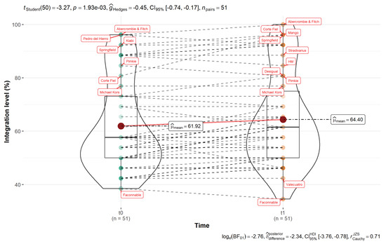 Figure 2 shows the main results of the channel integration analysis. From Figure 2, we observe a significant increase of 2.5 points in channel integration levels across large clothing and apparel retailers, in support of H3. This means that, on average, retailers integrated one new service in their omnichannel offerings. Figure 2 shows that, despite the global trend in improving multichannel and omnichannel services, a few retailers decreased their service offerings; the most notable change was that of Façonnable, mentioned earlier, which closed most of their physical stores during the pandemic.