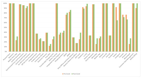 Second, the analysis seems to confirm that omnichannel operation strategies are being implemented in different phases. Iglesias-Pradas et al. [24] suggest that retailers adapt their day-to-day operations to multiple channel configurations and then implement IT-supported services to improve customer shopping experiences, as seen in this study (e.g., relatively slow levels of integrated stock and shopping history services). However, the study shows that the implementation of some services may have been disrupted by the pandemic; for example, there was a trend in retailing to provide a wider range of fulfilment options before the pandemic, but companies have mostly maintained their delivery and return options; this is largely due to the decrease in activity in physical stores, which made it risky to invest in these services (e.g., BORIS, BOPIS) at the time, despite these services being well-received and extensively used by shoppers [72].